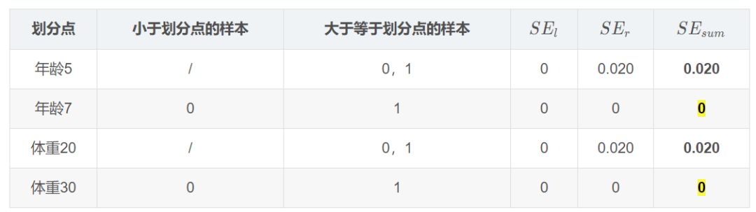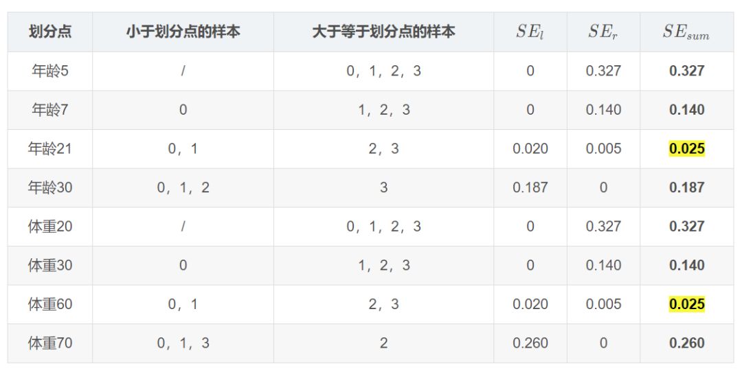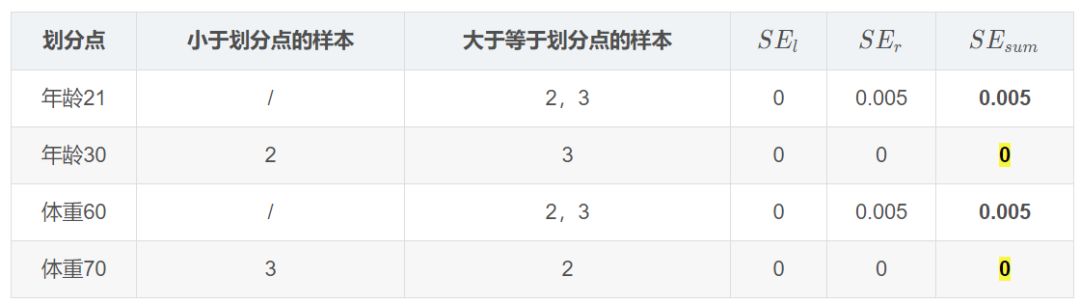 以上划分点是的总平方损失最小为 0.025有两个划分点:年龄21和体重60,所以随机选一个作为划分点,这里我们选 年龄21