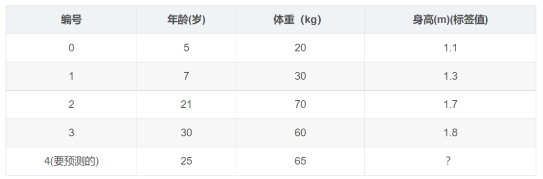 如下表所示:一组数据,特征为年龄、体重,身高为标签值。共有5条数据,前四条为训练样本,最后一条为要预测的样本。