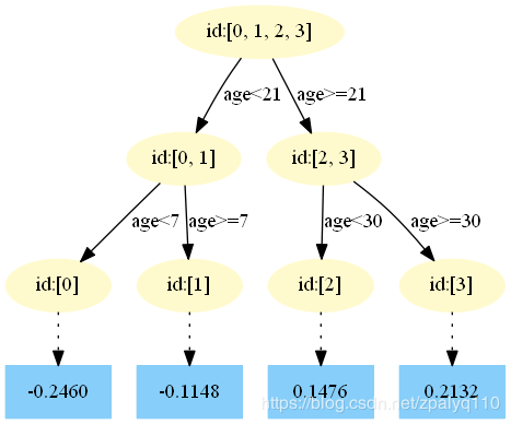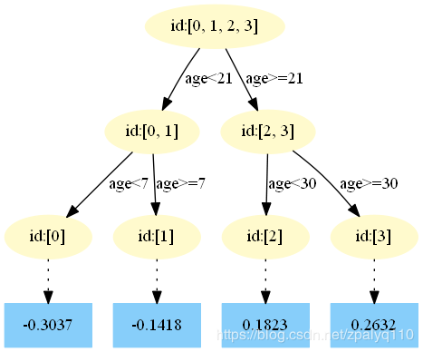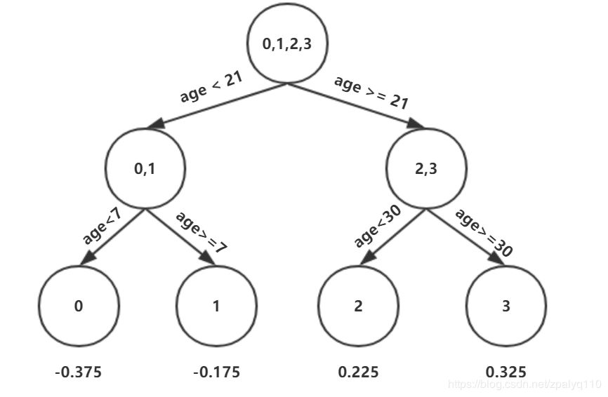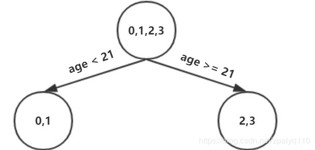 例如:以年龄 7 为划分节点,将小于 7 的样本划分为到左节点,大于等于 7 的样本划分为右节点。左节点包括 x0,右节点包括样本 ,