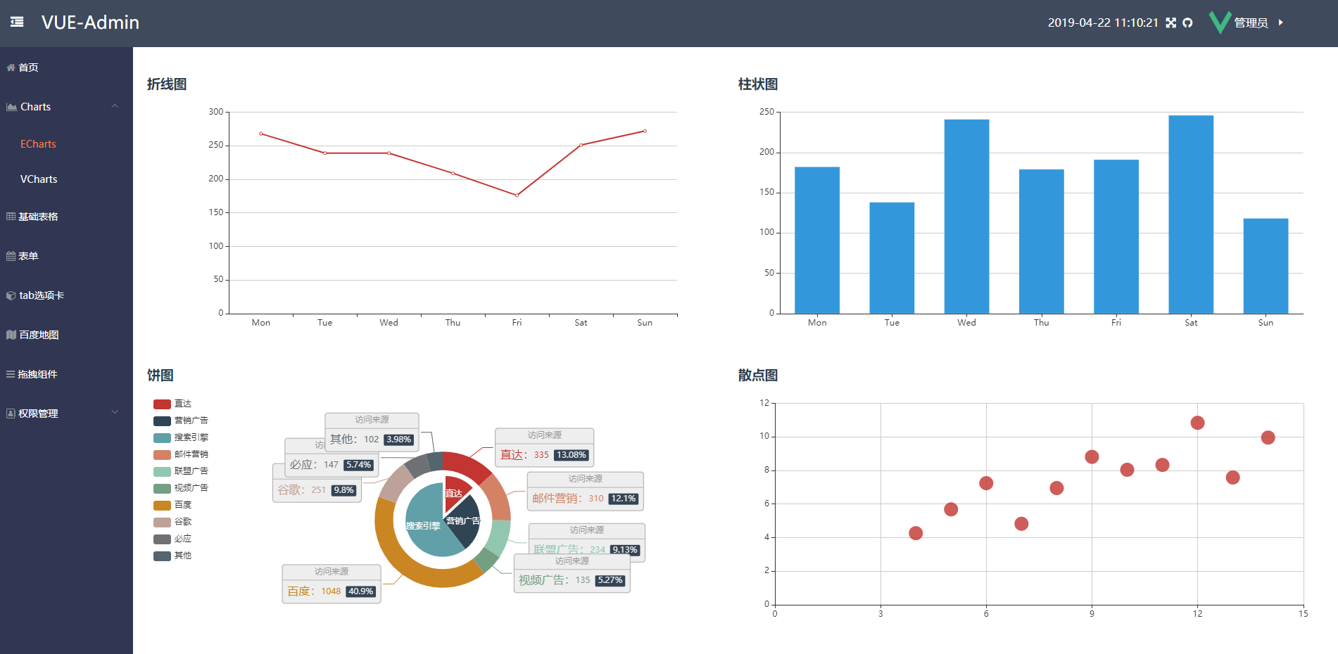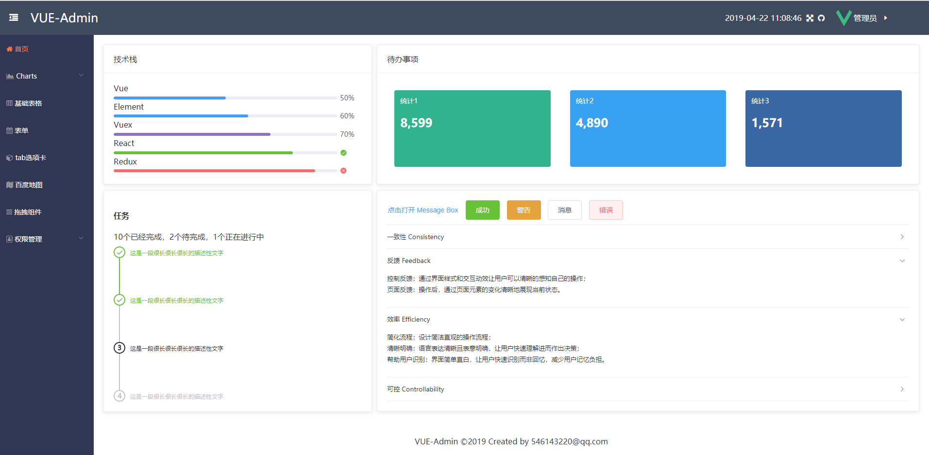 vue-admin是一个Vue+element-ui+vuex的后台管理模板,对于有vue基础的同学可以轻松上手该项目。vue管理台的模板大家应该见过不少,所以我这篇文章一些基础的东西不会介绍,只总结自己认为比较重要的和实际工作中的一些操作。