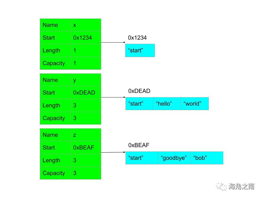 但是需要注意,在代码示例1,2个不同的协程,要向 x 中分别添加元素:"hello", "world" 和 "goodbye", "bob" ,所以,Golang 需要新开辟内存空间,切片 x 的内存变化如图: