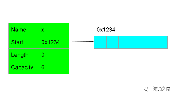 在这个切片中,名称为 x ,长度为 1,容量也为 1 。