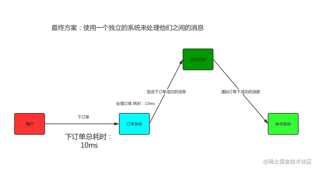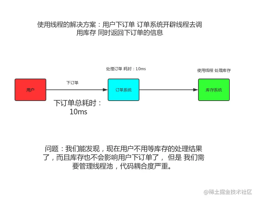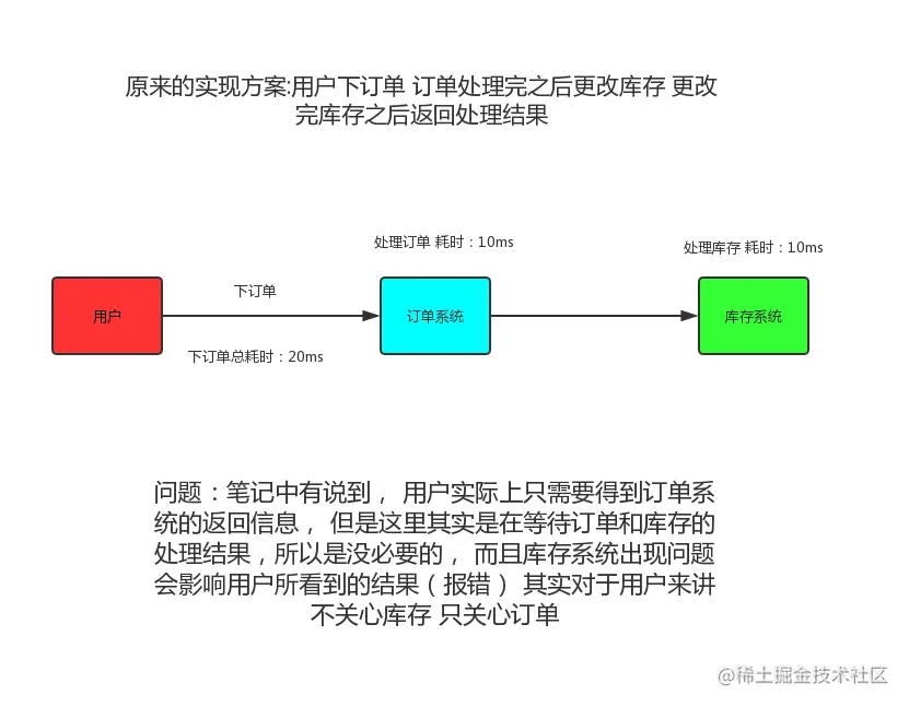 我们用java来举例子, 打个比方我们客户端发送一个下单请求给订单系统(order)订单系统发送了 一个请求给我们的库存系统告诉他需要更改库存了,我已经下单了,这里,每一个请求我们都可以看作一条消息,但是我们客户端需要等待订单系统告诉我这条消息的处理结果(我到底有没有下单成功) 但是 订单系统不需要知道库存系统这条消息的处理情况 因为无论你库存有没有改动成功, 我订单还是下了, 因为是先下完了订单(下成功了) 才去更改库存, 库存如果更改出BUG了 那是库存系统的问题, 这个BUG不会影响订单系统。 如果这里你能理解的话,那么我们就能发现我们用户发送的这条消息(下订单),是需要同步的(我需要知道结果),订单发送给库存的消息,是可以异步的(我不想知道你库存到底改了没,我只是通知你我这边成功下了一个订单)那么如果我们还按原来的方式去实现这个需求的话, 那么结果会是这样: