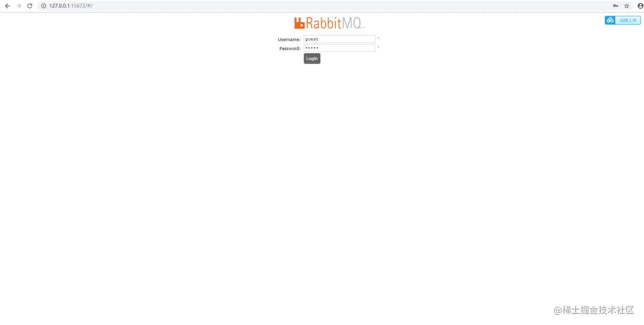 输入完启动命令后 稍微等一下会有结果返回 然后可以打开浏览器 输入 http://127.0.0.1:15672 访问管理页面:
