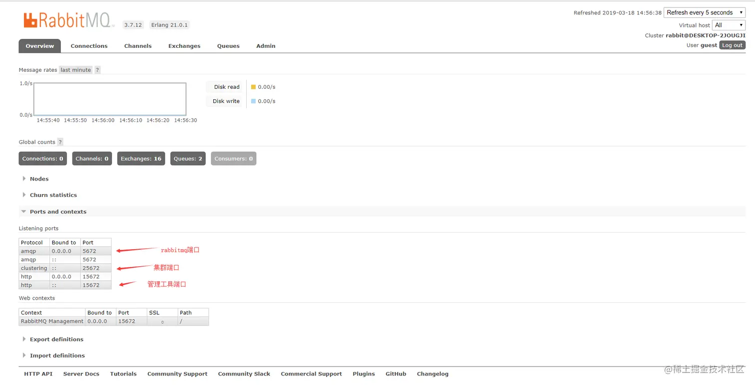 默认账号密码都是 guest 即 username :guest password:guest 登录进去之后会看到如下界面(因为我不小心装了2次RabbitMq 所以这里能看到都重复了, 你们自己那不会重复,然后我们刚刚说了 管理工具和rabbitmq 是两码事 所以端口也就不一样)