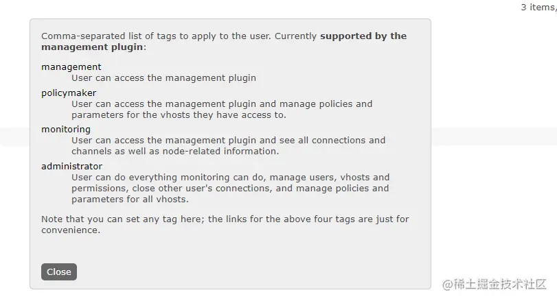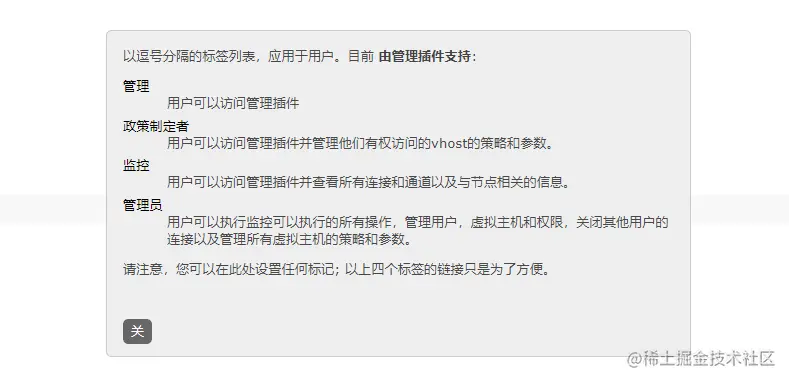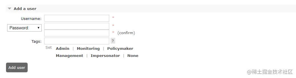 然后输入账号 密码 确认密码 这个Tags其实是一个用户权限标签, 关于他的介绍可以看官方介绍(点旁边那个小问号就好了,我这里直接翻译他的介绍)