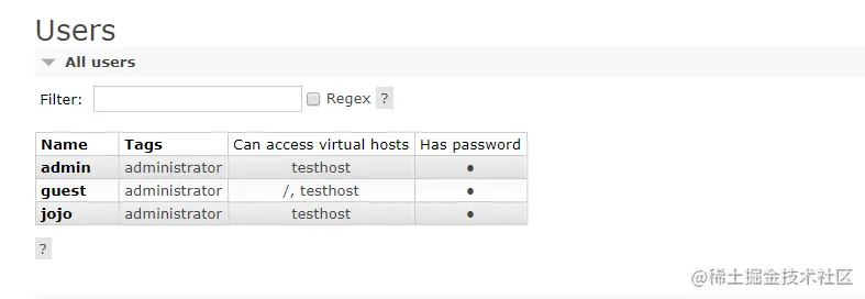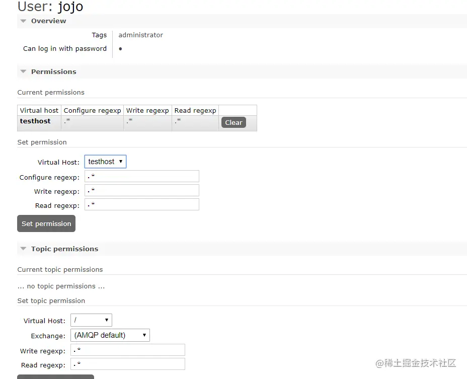这里 我们给了他 testhost这个Virtual host的权限 正则匹配都是* 也就是所有权限 然后点击set添加完毕 那么管理页面 我们就讲到这里