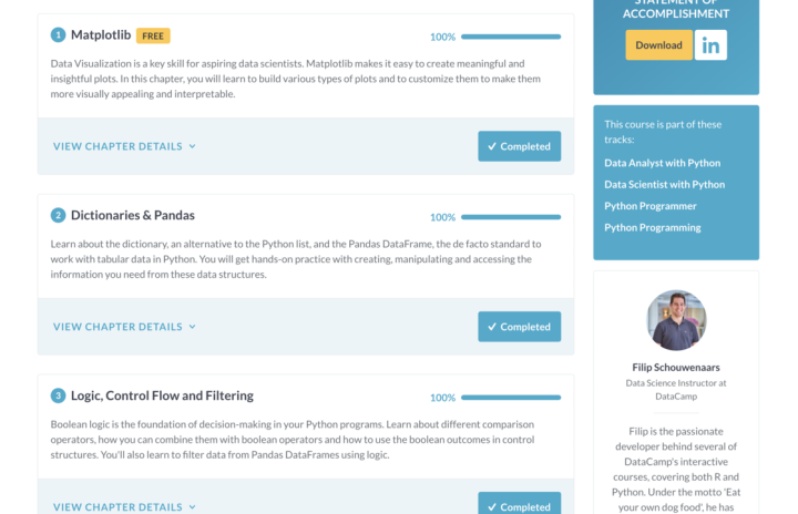 DataCamp 是一个互动性的 MOOC 网站,视频类的讲解偏少,更多的是文字直接指导你进入实战项目。同时 DataCamp 也是我最推荐的数据科学入门网站,从 Python 与 R 的基础讲解到数据处理流程,从机器学习到深度学习,它都有涉及。如果没有时间尝试不同的 MOOC,认真刷完它的一个 Career Track 就够用了。