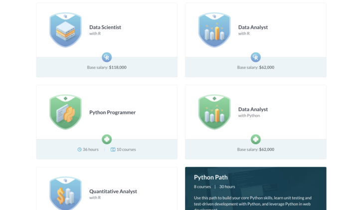 - 帮你预先安排好了课程列表:网站将一个个课程打包为 Skill Tracks 和 Career Tracks ,如下图。不论你是想学 Python 还是 R,想成为数据分析员还是数据科学家,只用找到相应的 Track 点进去跟着学就好了,不用再纠结下一步学什么技能。当然,这些列表是灵活的,你完全可以跳过某个 Track 的一些课程。