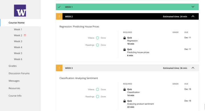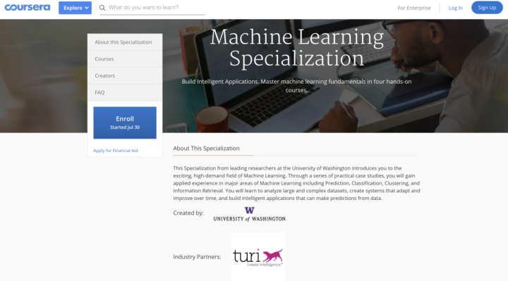 Machine Learning Specialization - University of Washington 是入门机器学习的优质课程,由华盛顿大学两位教授主讲。此课程是一个系列,原本总共有 6 个 course,分别讲解机器学习基础(Machine Learning Foundations)、回归(Regression)、分类(Classification)、聚类(Clustering)、矩阵分解(Matrix Factorization)、深度学习(Deep Learning)。每个 Course 大约 6 个章节,每个章节学习时间大约 3 小时。