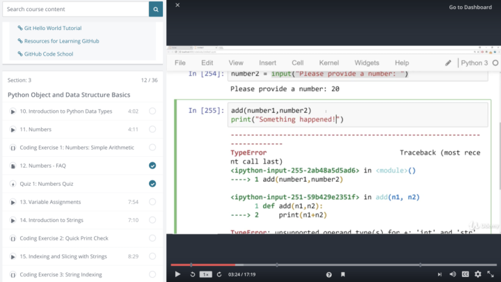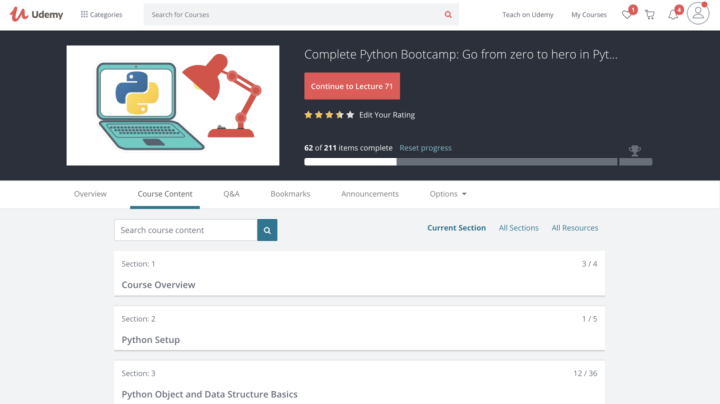 Complete Python Bootcamp: Go from zero to hero in Python 3 是入门 Python 比较推荐的课程,导师讲解很细致,边编程边讲,从 Python 最基础的数据结构、到函数和方法,再到模块和类,内容安排很合理,且每章都有作业可以检测自己的学习。