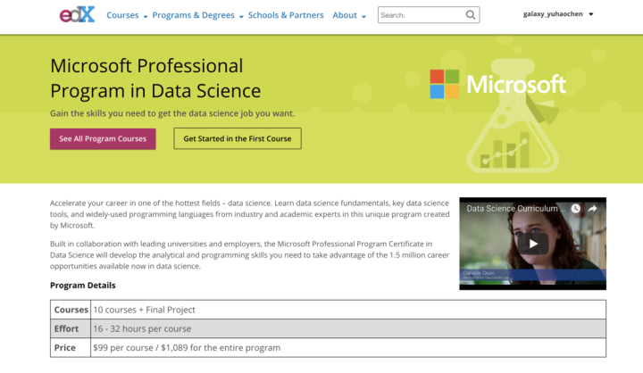 微软推出的数据科学课程 Microsoft Professional Program in Data Science,课程内容比较全面,有 Python 和 R 语言两条支线,可以任选一条完成课程,当然也可以都掌握。同时也将 Excel 以及自家云平台 Azure 融合进课程,用微软系的朋友可以更多关注一下。