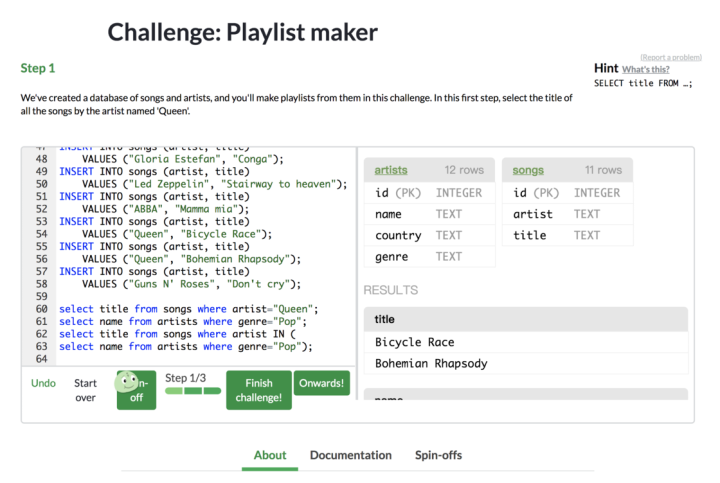 我在 Khan Academy 上学的 SQL 基础用法。同 DataCamp 一样,代码可以直接在这个网站上运行,无需本地安装环境。上课过程中互动性也很强,同时运用积分制让你每完成一个项目都会有成就感。