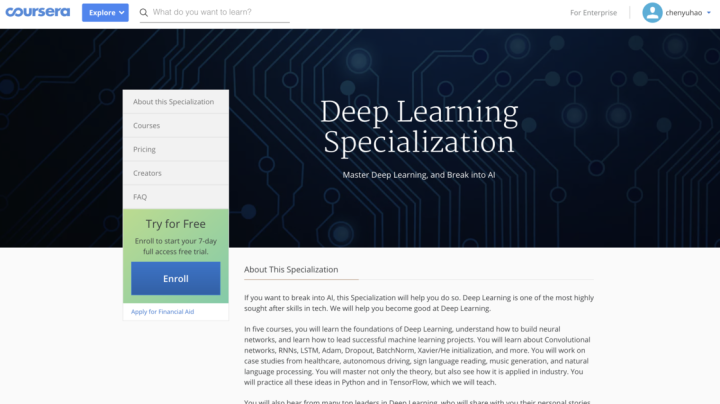 同样是吴恩达领衔的深度学习课程 Deep Learning Specialization,共有 5 个 Course,包括神经网络和卷积神经网络。