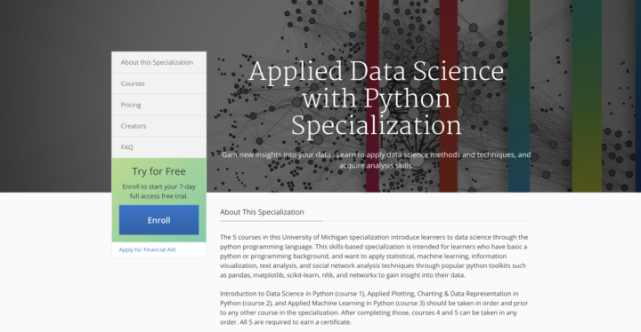 密歇根大学的系列课程 Applied Data Science with Python Specialization,据说对新手比较友好,共 5 个 Course,从基础到机器学习以及深度学习都有介绍,比较全面。