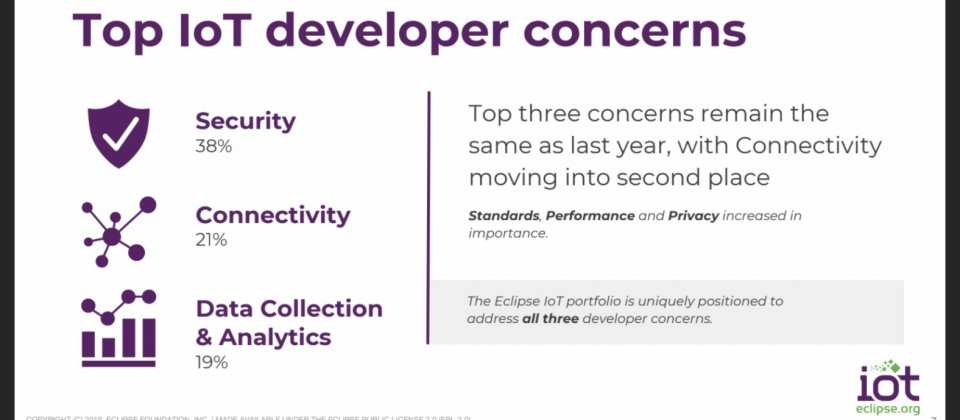 Eclipse基金会物联网工作小组释出第五年的全球物联网开发人员调查,参与调查的开发人员有1,717人,根据调查结果,Eclipse基金会认为,整体来说物联网已经是更为实际的技术,企业开始投入人力发展物联网项目,有三分之二的受访者表示,自己的组织正在进行或是在未来18个月内,会开发或是部署物联网解决方案,仅有9%的受访者表示,组织目前没有开发物联网解决方案的计划。受访者关注物联网的领域,第一名是物联网平台,接下来是家庭自动化以及工业自动化,在过去几年,物联网平台也一直是物联网开发人员的关注焦点,Eclipse基金会提到,这暗示着企业将投入资源建立自己的物联网平台,而由于企业要在自建机房运作物联网解决方案,因此也代表着混合云会在物联网应用发光发热。对于开发物联网项目来说,开发人员最关心的议题仍然是安全,在通讯安全和数据加密两项都有38%的受访者觉得重要,而JWTs(JSON Web Tokens)则也有26%,另外,值得注意得是,虚拟化在物联网应用的安全上也逐渐受到关注。