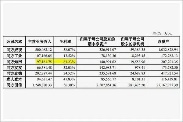 根据清华同方的2017年财报和2018年公布的半年报显示,知网2017年年收入超过9亿,2018年半年收入超过5亿,预计全年收入过10亿,毛利率超过61%。