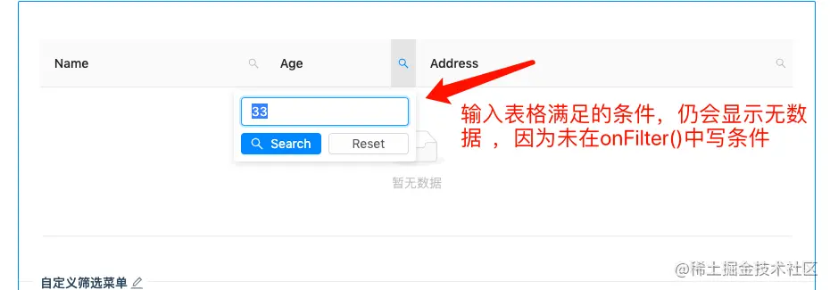 在onFilter()中不写筛选条件,在调用filterDropdown进行列筛选的时候,通过handleSearch改变/保存dataSource的状态,此时<Table>重新渲染,但是拿的不是dataSource={xxx},而是拿的filterDropdown中的onFilter()中的dataSource,而onFilter中是没有写代码的,所以返回暂无数据。