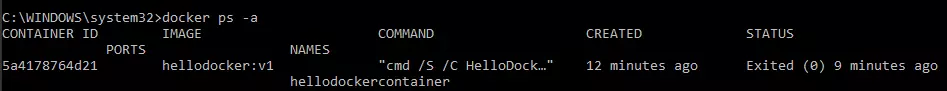 该指令的意思是基于hellodocker:v1镜像来运行一个名为hellodockercontainer的容器。有一个细节大家需要注意一下就是在本机运行时输出的Machine Name是机器的computer name,而在容器中运行时输出的Machine name为容器的ID。我们可以通过指令docker ps -a来查看已经创建的容器,如图Image-8所示: