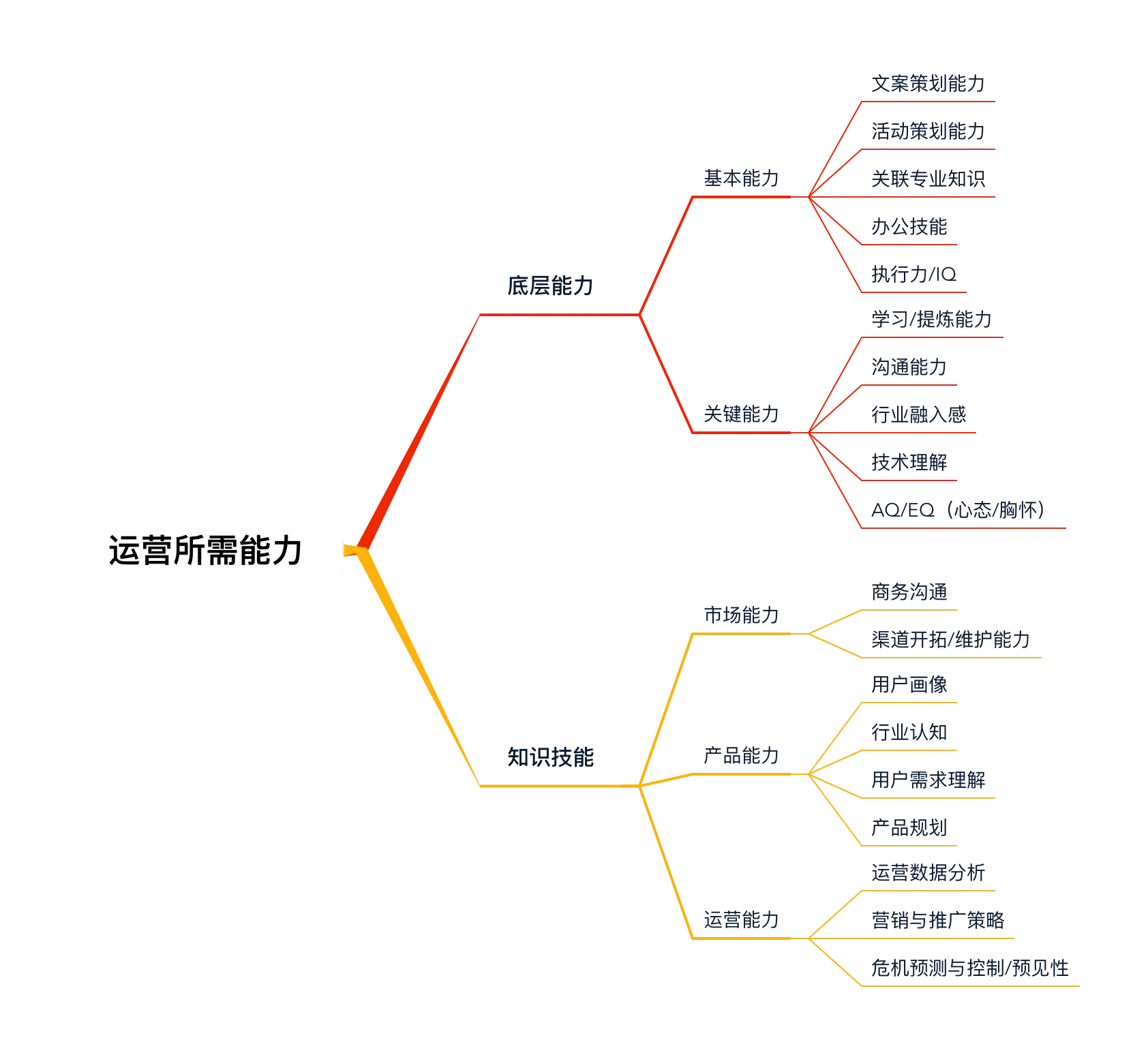 在进行以上问题的思考后,我们可以对自己想要累积的知识有明确的方向,这时我们可以用 XMind: ZEN 进行个人能力的梳理和知识体系的架构,把脑中的思考可视化,构建出自身需要建立的知识体系框架。