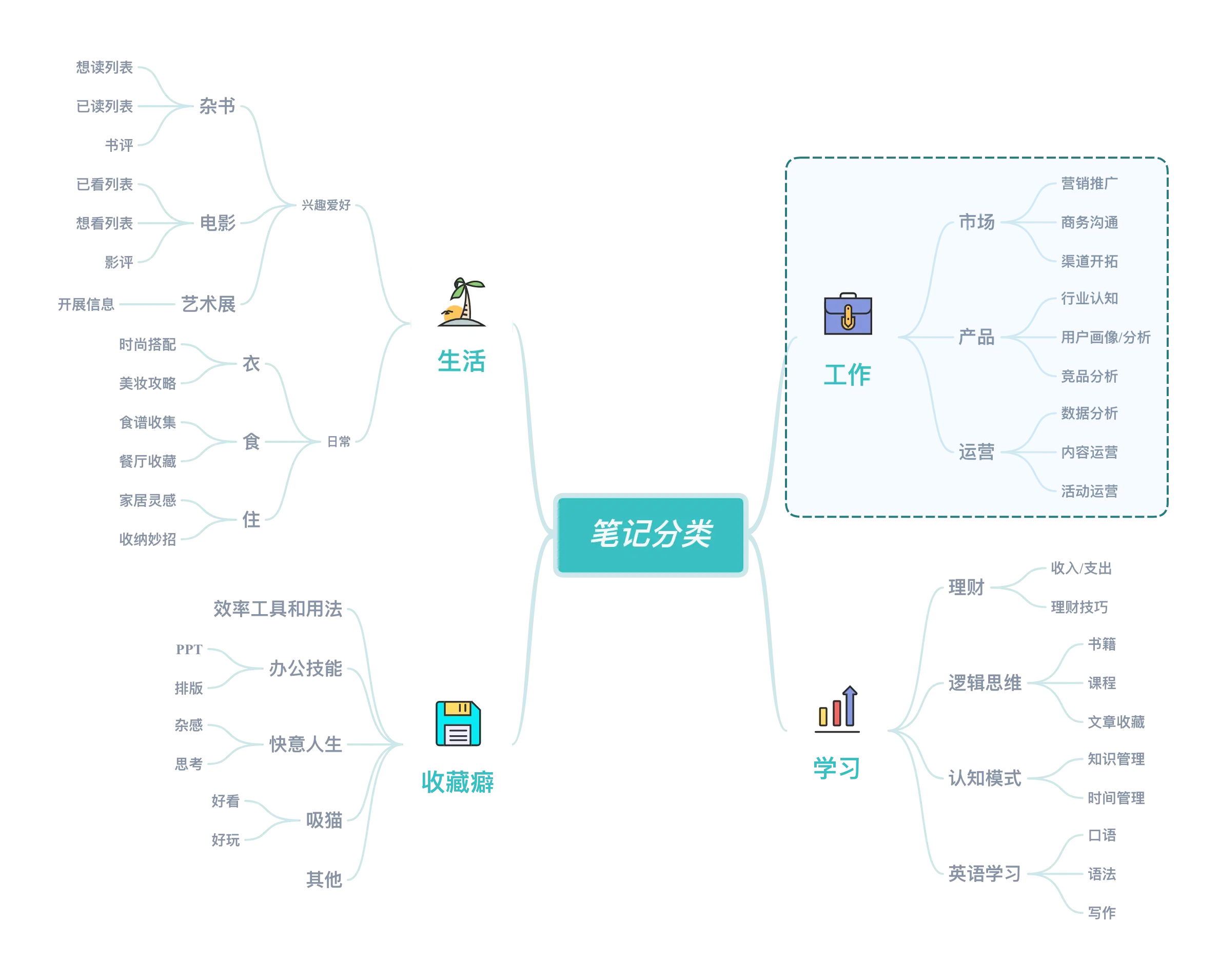 首先用 XMind: ZEN 进行个人知识结构的解构,按照这个结构在印象笔记内进行笔记框架的构建。比如说你可以从工作、工作、生活的分类入手,结合上面个人能力的梳理和知识体系的架构,进行整体的梳理和规划。
