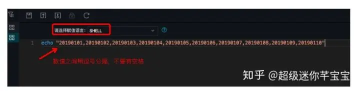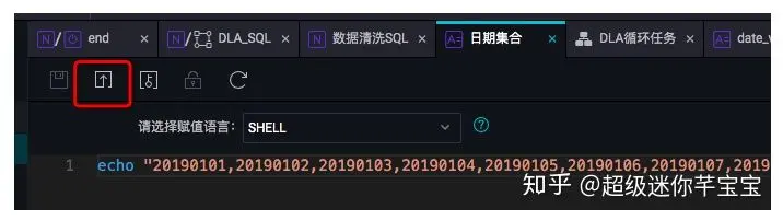 打开节点“日期集合”的编辑页面。这里我们选择SHELL语言,将要执行的日期值写在一个数组里。