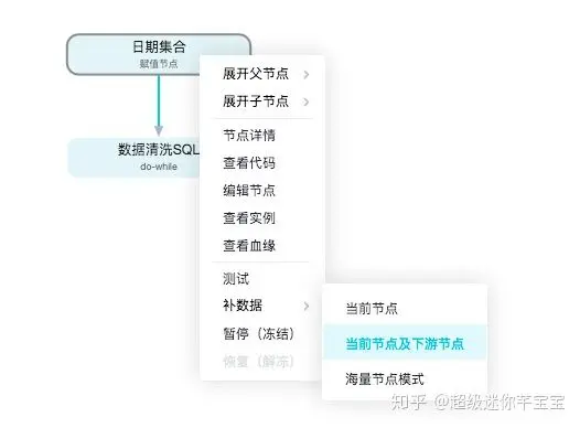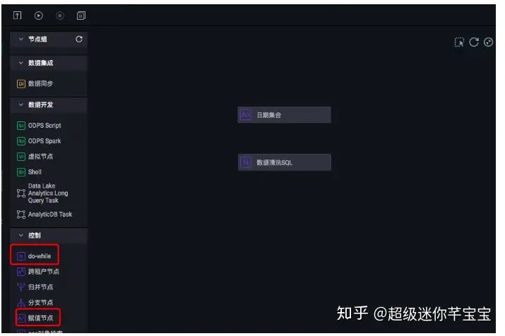 - 部署一个循环节点。该节点包含用来做数据清洗的一个或者一组SQL,其中关于日期取值是一个变量。每次循环输入值由赋值节点提供。