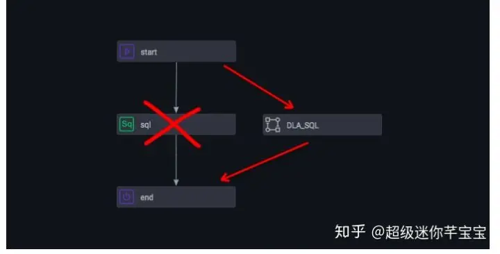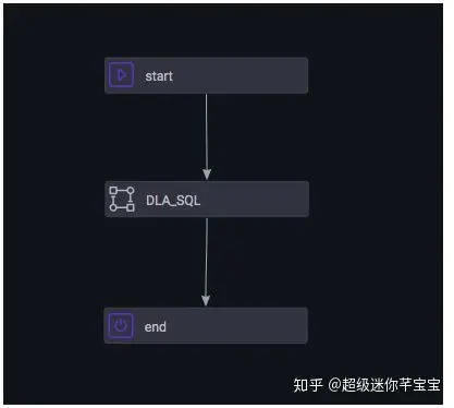 双击循环节点进入编辑页面。可以看到三个节点,分别是start, sql和end。这里我们需要新建一个DLA的任务节点,并把sql替换为一个DLA的任务节点。