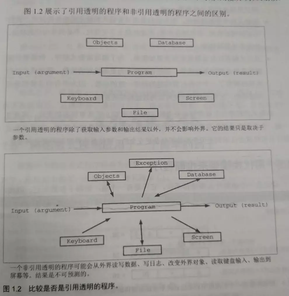 没有副作用(并不会改变外界的什么)并不足以让程序编程函数式的,同样函数式编程也不能被外界所影响——函数式程序的输出只能取决于自己的参数,这就意味着函数式代码不能从控制台、文件等读取数据,既函数式代码是引用透明的(不被外界影响到的代码是引用透明的)。