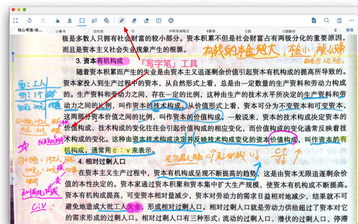 而对于不能进行文字选择的 PDF 文件,用 iPad 和 Apple Pencil 通过「写字笔」工具划出重点,手写笔记。