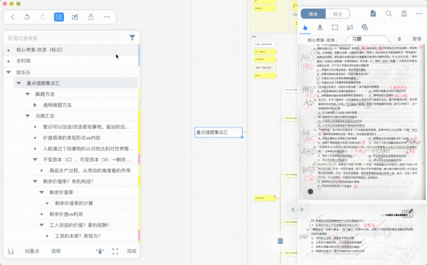 政治题目因为有很多需要将零散的知识结合串联起来的题目,比如各种土地法的梳理、各种毛爷爷的文章的整理、中共每一次会议的主题特点,涛涛都会要我们拿出笔记本来做笔记~ 我们就可以用 MarginNote 3 来做某个线索的梳理,让散落一地的知识串联起来!