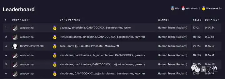 比较有趣的是,在OpenAI公布的榜单中,第一名取得了5连胜的记录,成绩排名前六的人类团队中,有五个团队的“队长”都是同一个人。