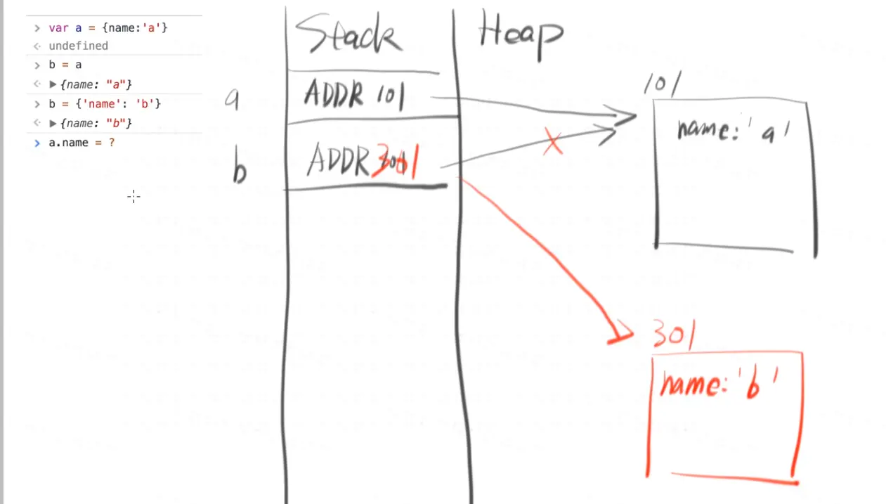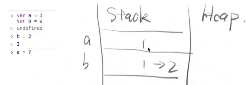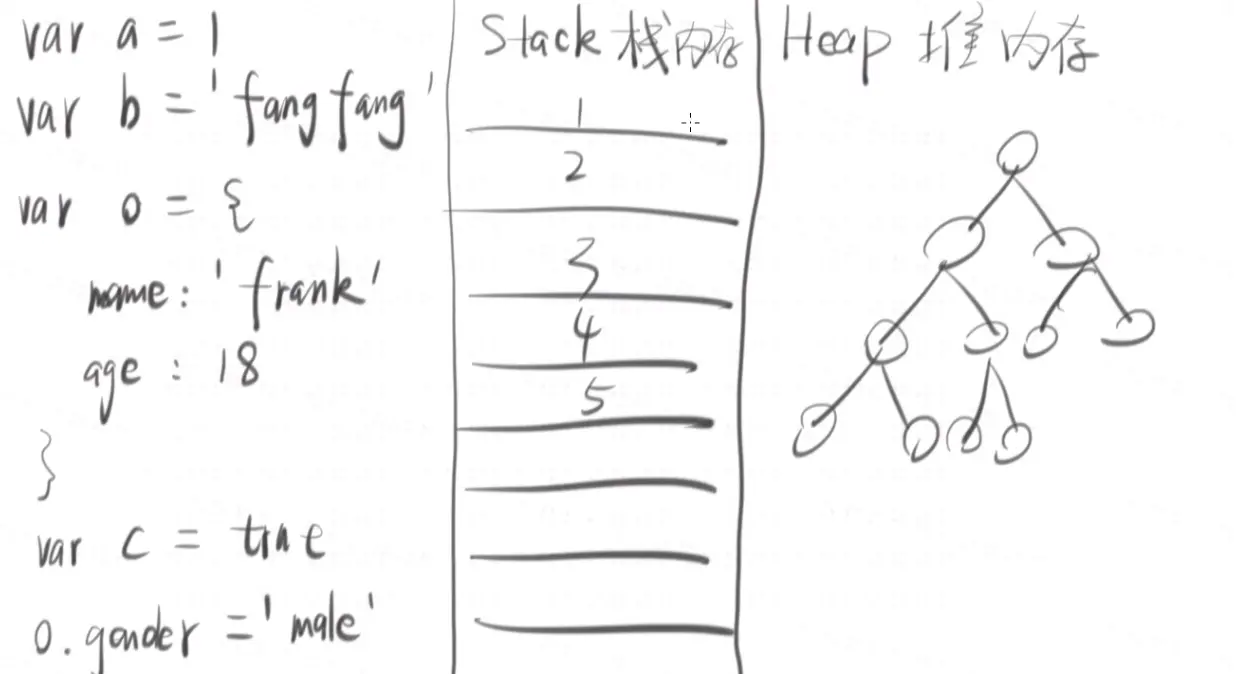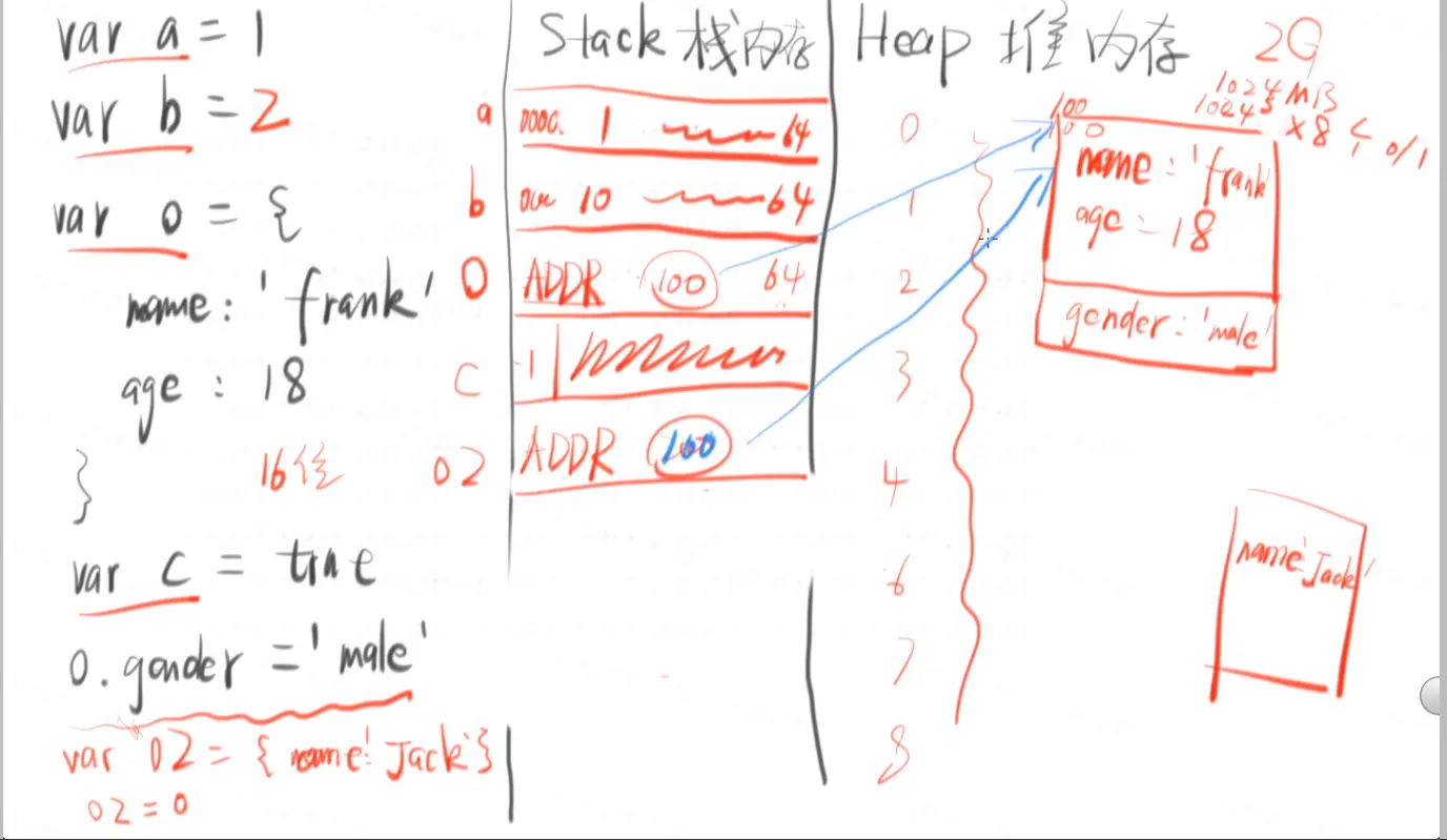 简单数据类型:直接stack存储 复杂数据类型:引用heap存储 - 所有的变量和内存(对象)之间的关系都是引用关系