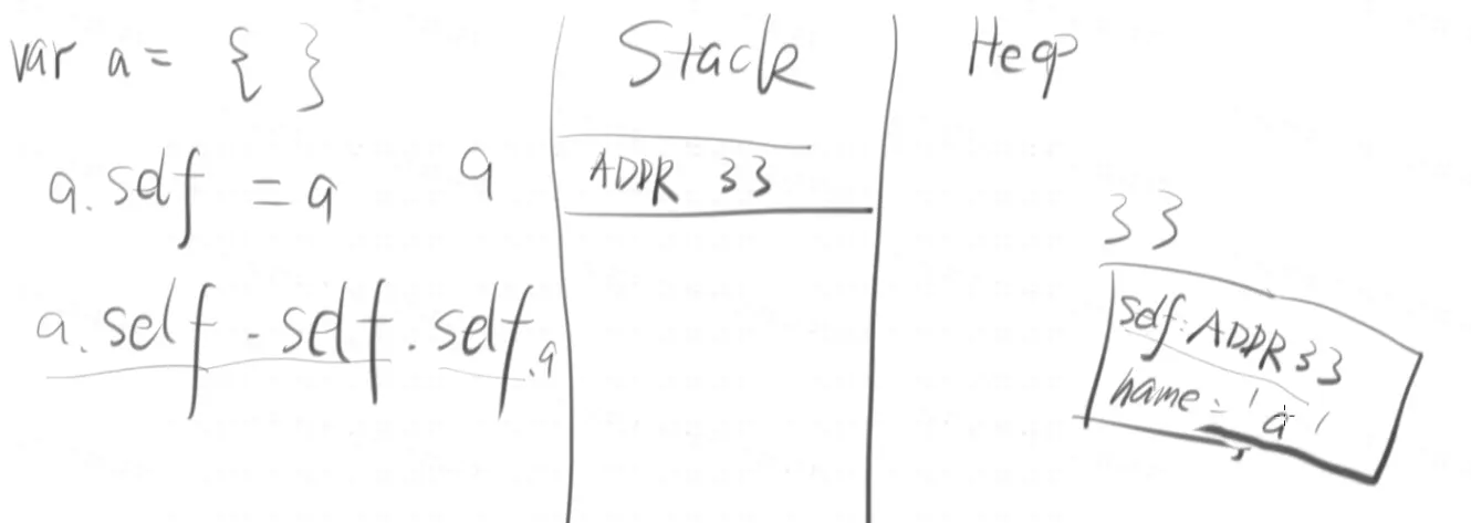 第一行:定义a = undefined, {self:undefined},将这块内存地址给a。