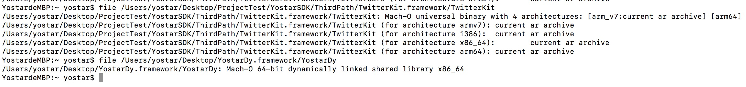 $ file /Users/yostar/Desktop/ProjectTest/YostarSDK/ThirdPath/TwitterKit.framework/TwitterKit;见下面的截图,一个是静态库,一个是动态库