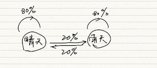 整体来说,晴天和雨天的总天数大致是一样的,但是晴天和雨天之间看不出有任何联系。这种模拟事实上是基于一个假设,晴天和雨天出现的几率都是50%,不管前一天是雨天还是晴天。你可以把这个想象为抛骰子。但是事实情况并非如此,今天的天气是晴天,那么明天晴天的概率会更高;今天是雨天,明天雨天的概率要更高。也就是说表现在天气记录序列上,晴天和雨天基本上都是连续出现的。如果有一个图来表示的话,就是这样的: