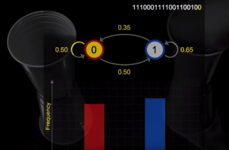 有两个杯子,装着两种不同颜色的豆子。第一个红色和蓝色一样多,第二个红色:蓝色为 0.35 : 0.65。现在从两个杯子里面随机拿豆子,如果是红色就放到第一个杯子,如果是蓝色就放到第二个杯子。这个例子里面,下一次的结果显然是受前一次结果影响的,因为上一次的结果会改变两个杯子中豆子的比例,而豆子比例会影响下一次拿出来的豆子会被放到哪个杯子的几率。(这是一个非常重要的性质,下一次事件几率受当前状态影响,但是不受之前事件影响,下面正式的定义还会讲到。)