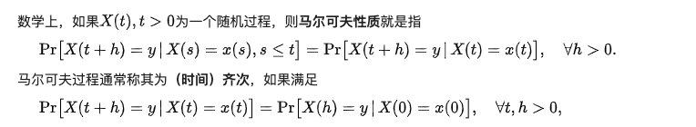 马尔可夫性质(英语:Markov property)是概率论中的一个概念,因為俄國數學家安德雷·馬可夫得名。当一个随机过程在给定现在状态及所有过去状态情况下,其未来状态的条件概率分布仅依赖于当前状态;换句话说,在给定现在状态时,它与过去状态(即该过程的历史路径)是条件独立的,那么此随机过程即具有马尔可夫性质。具有马尔可夫性质的过程通常称之为马尔可夫过程。- 来源于维基百科