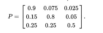 上图用一个有向图来表示状态的转移,圆圈表示市场是牛市(Bull)、熊市(Bear)还是停市(Stagnant)。图中显示,市场为牛市时,下一个周期90%的概率还是牛市,7.5%的概率变为熊市,2.5%的概率变为停市。同样当前时熊市或停市时,下一个周期市场情况的概率分布也很容易看出。这个状态之间转移的概率可以用一个矩阵表示: