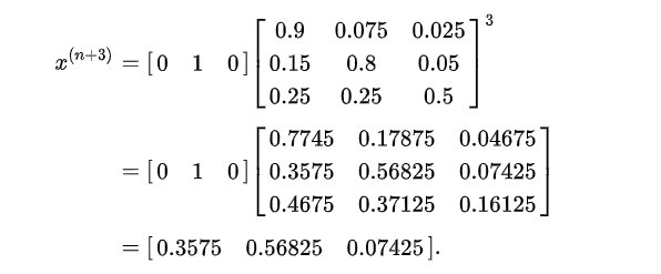 如果n时刻市场行情的概率分布用 x(n) 表示,那么n+1时刻的状态就可以表示为 x(n) * P(这里的依据是前面提到的马尔可夫性质,概率分布具有时移性),这是一个矩阵乘法。再这么往下推算两步,可以得出n+3时刻的概率分布:
