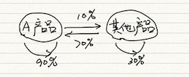 有一家公司,生产了一款产品 A,占有20%的市场份额。现在假设,投放广告后,一个周期后,之前用 A 产品的用户,有90%会继续使用 A;不使用 A 的用户,有70%接下来会使用。用一个 FSM 来表示状态转移情况: