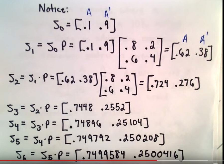 最终的状态[0.75, 0.25]叫作stationary matrix(固定矩阵 -> 来自于 Google 机翻),达到这个状态时,就说系统达到了稳定状态(steady state)。如果说,对于一个马尔可夫链,如果他最终就趋于stationary matrix这个极限矩阵,那么就说他是一个常规的马尔可夫链(regular markov matrix)。当然这也就是说,不是所有的马尔可夫链都会趋向于一个极限。