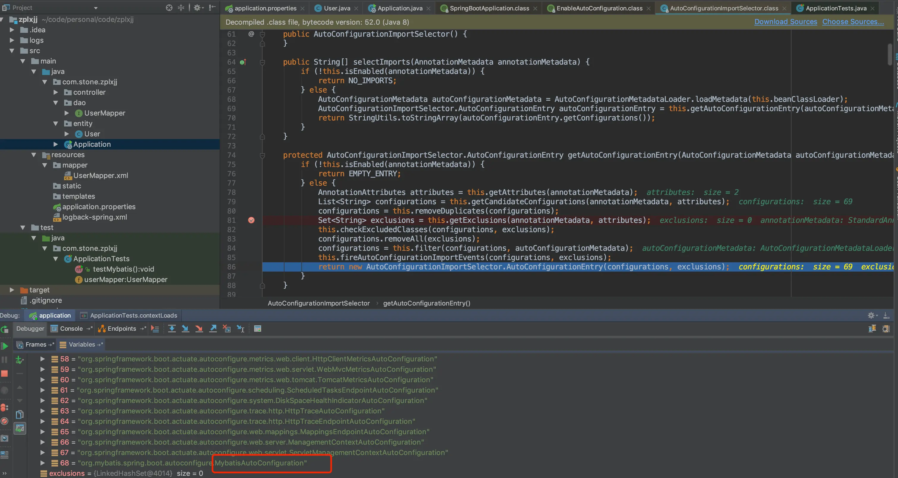 通过项目启动后,打上注解,可以看到MybatisAutoConfiguration引入了进来