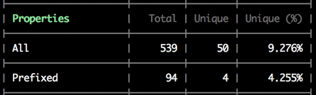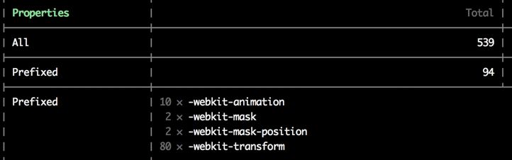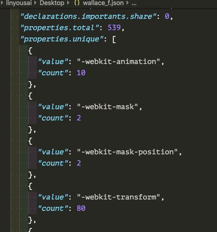 这截图部分是属性使用次数的数据,在前面所提到的表格形式中也是没有的。整个 json 文件都有哪些,https://github.com/projectwallace/css-analyzer 这里都已经有了具体示例说明了。