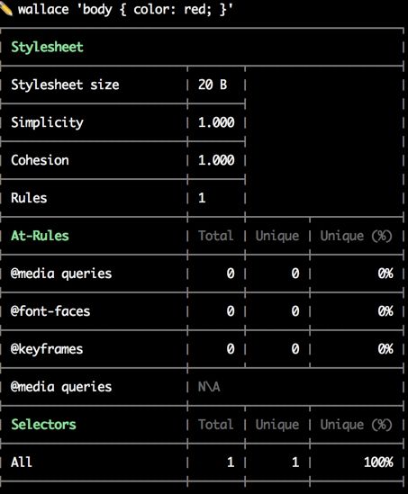 $ wallace https://projectwallace.com$ wallace 'body { color: red; }'$ echo 'html { font-size: 16px; } | wallace$ wallace 'html {}' --format=json$ cat style.css | wallace --compact$ curl http://localhost/css/style.css | wallace