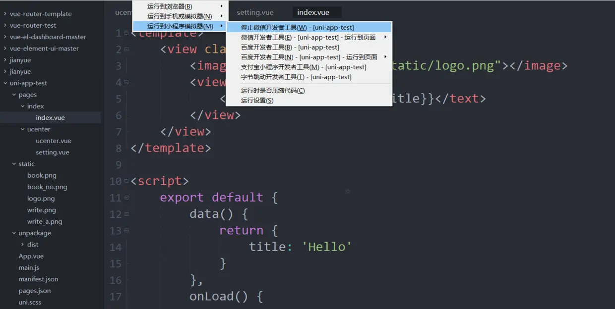 新建一个目录ucenter,该目录下新建两个vue文件ucenter.vue和setting.vue