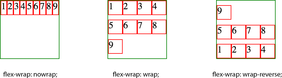 1 2 3 | nowrap (不换行)默认wrap (换行,且往下一行换)wrap-reverse (换行,且往上一行换) |