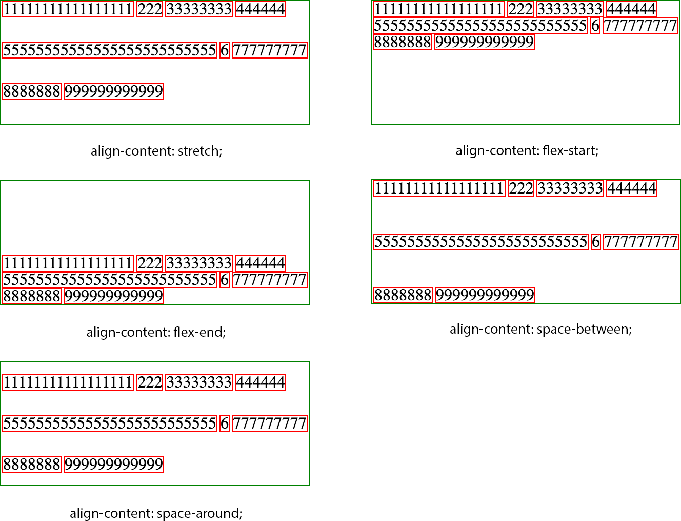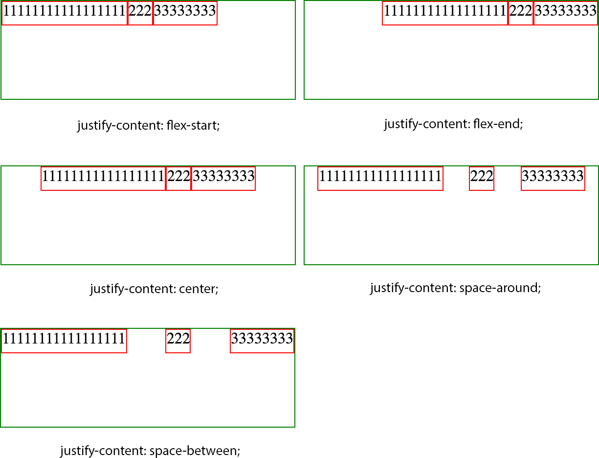 1 2 3 4 5 | flex-startflex-endcenterspace-betweenspace-around |