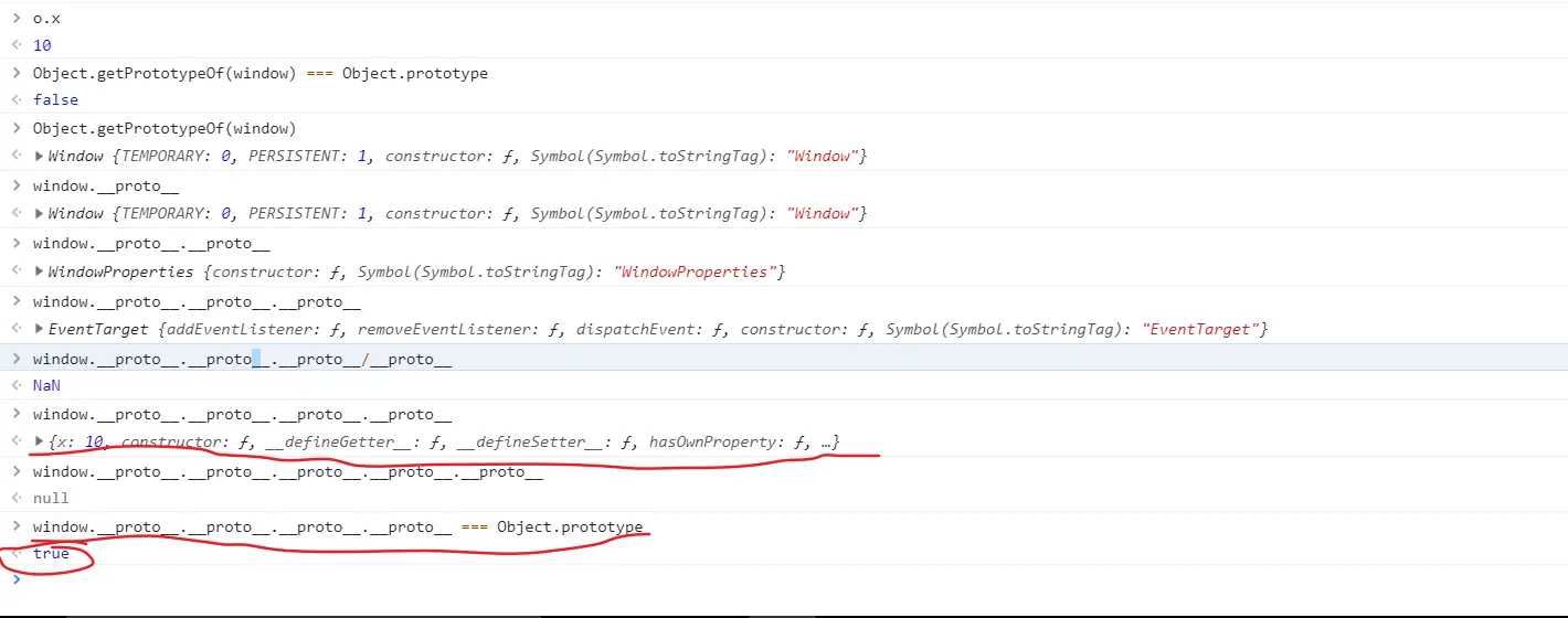 可以看到window原型链的末端节点为Object,终于在这里找了x,输出了10