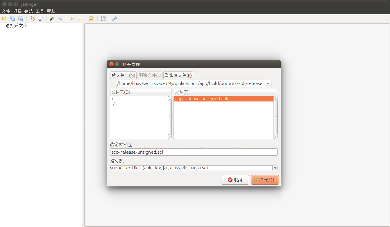 用法很简单,下载之后解压,然后进入bin目录运行jadx-gui(linux/mac)或者jadx-gui.bat(windows),就可以启动一个可视化的界面了,然后点击"文件->打开",并且选择我们想要反编译的应用,就能看到apk里面的代码了